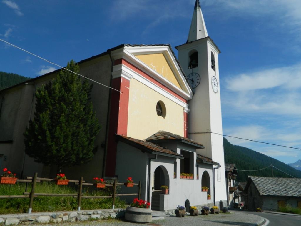 All’esterno, a destra del campanile, in cui è murata una pietra recante l’anno 1841, è visibile l’antico cimitero caratterizzato da una grande croce in pietra recante la scritta “Ici reposent nos ancêtres”.