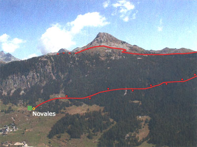 In località Col Pilaz ha inizio il percorso (1954 metri s.l.m.) il quale seguendo la pista forestale, in direzione Champ-Long, a quota 2280 devia per salire verso la base del Mont Tantané. Raggiunto il sito archeologico a circa 2300 metri la passeggiata prosegue scendendo verso valle lambendo il confine comunale fino a raggiungere la località Champ-Cellier a 2095 metri. Il sentiero, che per un tratto semi-pianeggiante percorre le curve di livello a quota 2100, termina scendendo verso la località Novales a quota 1670.
